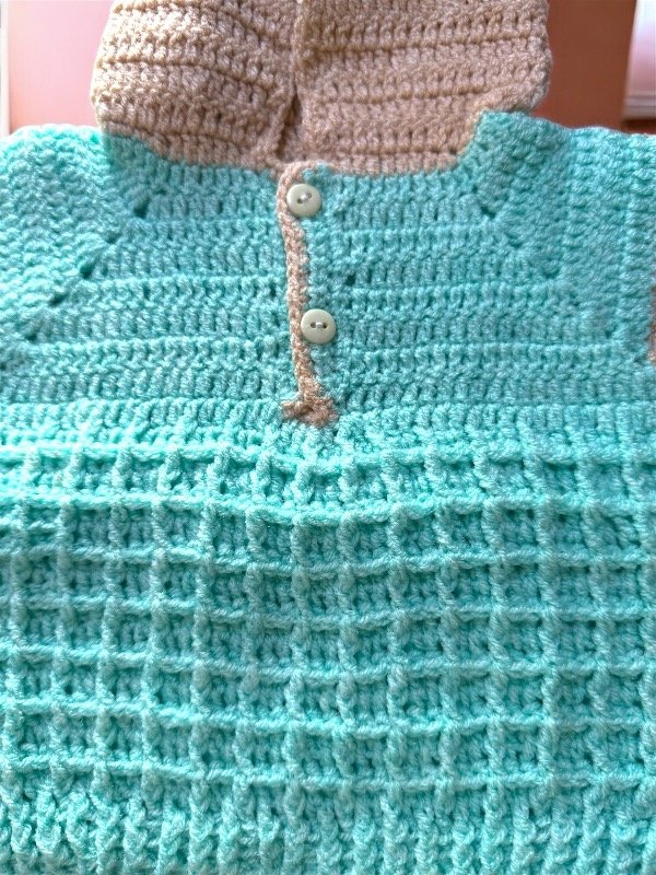 Chaleco tejido a dos agujas, 100% lana con capucha. El talle va de cero a un mes y medio aproximadamente, hay que tener en cuenta que la lana cede y puede rendir en más tiempo.